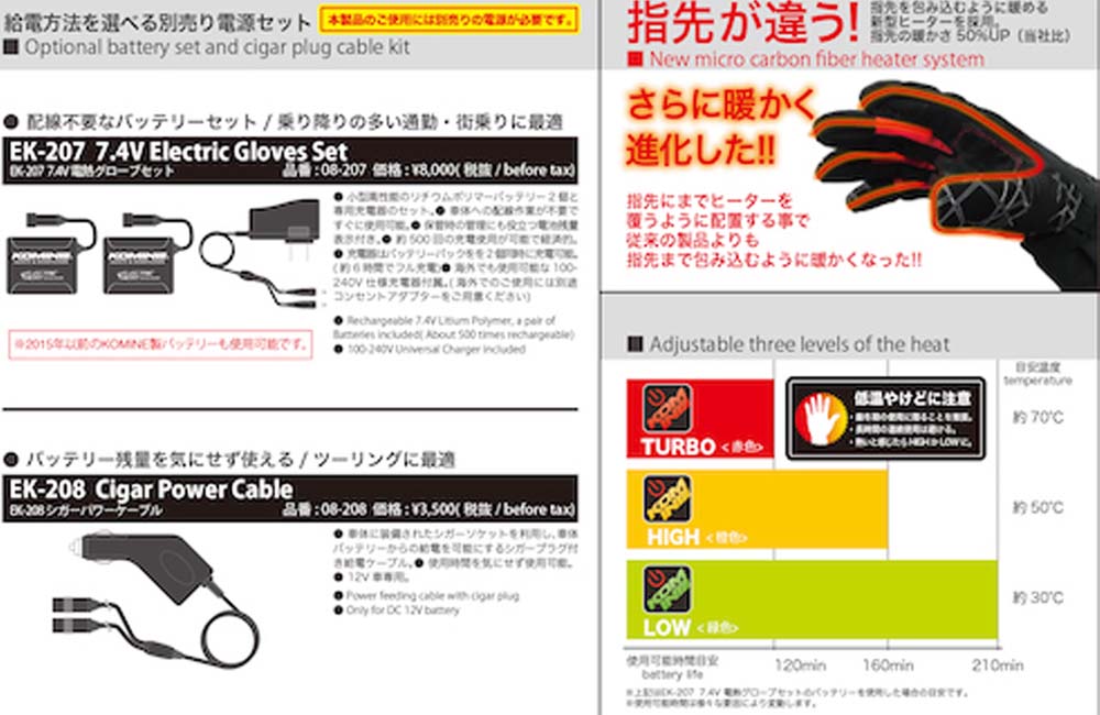 ・品番:08-205 ・サイズ:S・M・L・XL・2XL・3XL ・カラー:ブラック・クラッシュブラック・クラッシュブラック/レッド ・素材:polyester・PU・nylon・goat leather・HiPORA ・プロテクターknuckle・finger・palm ※オプション:電熱機能を使用するには EK-207 7.4V電熱グローブ用セット、 またはEK-208 シガーパワーケーブルを 別途ご用意ください。
